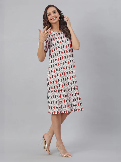 Elevate your casual wardrobe with White Ikkat Printed Cotton Tiered Dress. The stunning red, gray, and black Ikkat print beautifully contrasts with the fresh white cotton base, while the tiered design adds a playful flair. The round neck enhances its elegance, and the puff sleeves adorned with potli buttons provide a charming touch.